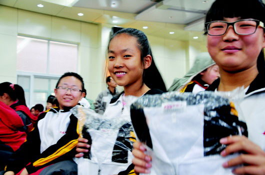领到“新的校服”后,一中七年级的学生们笑得合不拢嘴。10日下午,滨州经济技术开发区中小学生“新校服”发放仪式在古井小学举行。