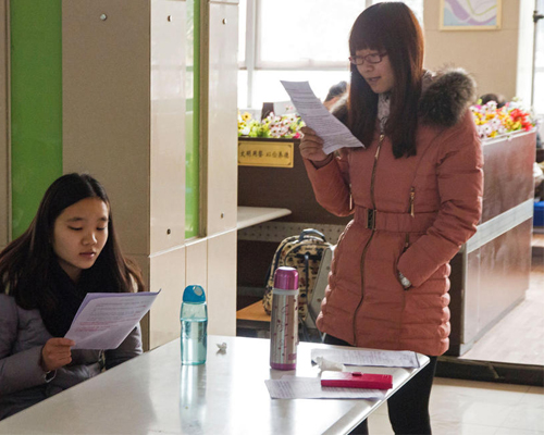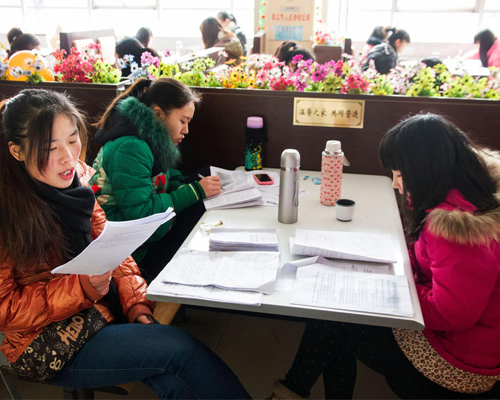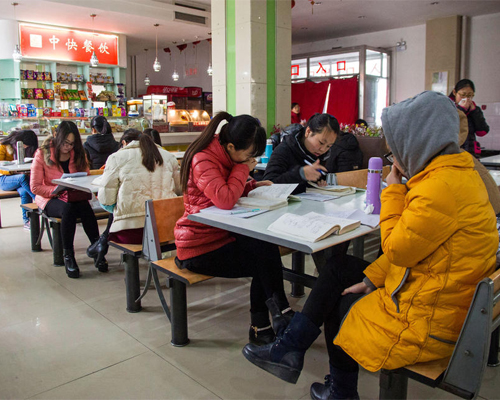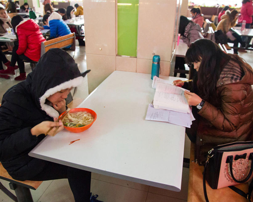 2015年1月6日,河南省新乡市,进入大学期末考试月,河南师范大学学生食堂内读书声不绝于耳,大量学生“占领”餐厅背书复习准备期末考试。