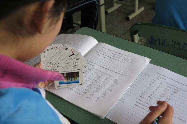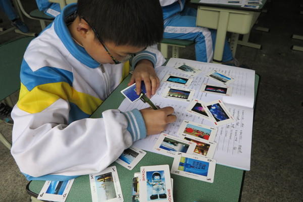 随后,记者来到学校活动课教室了解同学们所说的“扑克牌记单词”。此时,陈茂娟老师正在利用“扑克牌”上英语课,不过,这副“扑克牌”可与市面上出售的不一样,它其实是机投中学校长田精耘发明的“英语学习卡”。